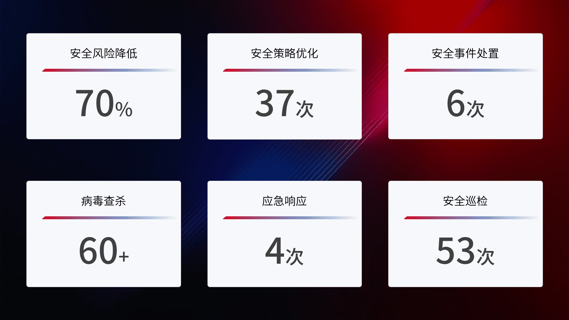 提供全面的安全事件报告体系,,,,包括处置报告、、、、周报、、、季度和年度总结,,,结合持续监控,,,帮助客户深入了解网络安全状况。。