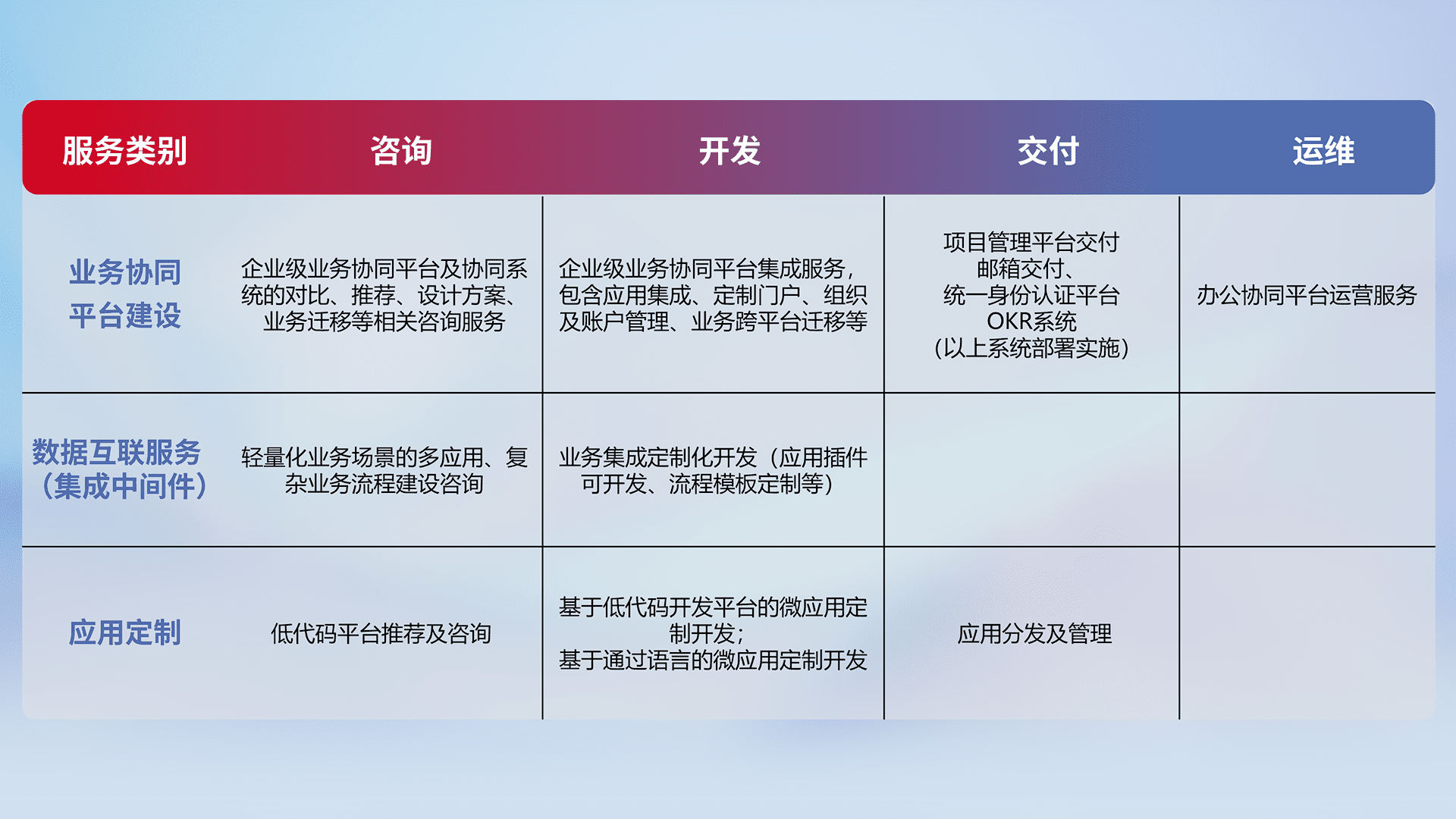 针对钉钉、、、、企微、、IDaas等平台级产品提供产品的规划、、方案、、、、交付、、定制化开发等服务,,,实现如统一协同办公、、、智能客户服务、、混合会议管理、、智能数据查询、、等业务场景,,,,实现数字化转型。。